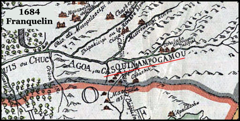 “We look at Franquelin’s 1684 map of North America. Between the Upper Forks of the “Casquinampogamou” are located three Cherokee villages, bearing the names, “Tchalaka”, “Cattogui” {Katowagi was the Shawnee name for the Cherokees), and “Taligui” [Chillicothe] the last name being identical in sound with the “Talligewi” of Lenape tradition as given by Heckewelder. [1] (On one of De l’Isle’s maps the Tennessee River is called “Riviere des Casquinambaux ou Cheroquis”. [2] The name “Casquinampo” probably comes from the “Casqui” or “Casquin” Indians referred to by some of the chroniclers of De Soto’s expedition.” [3]