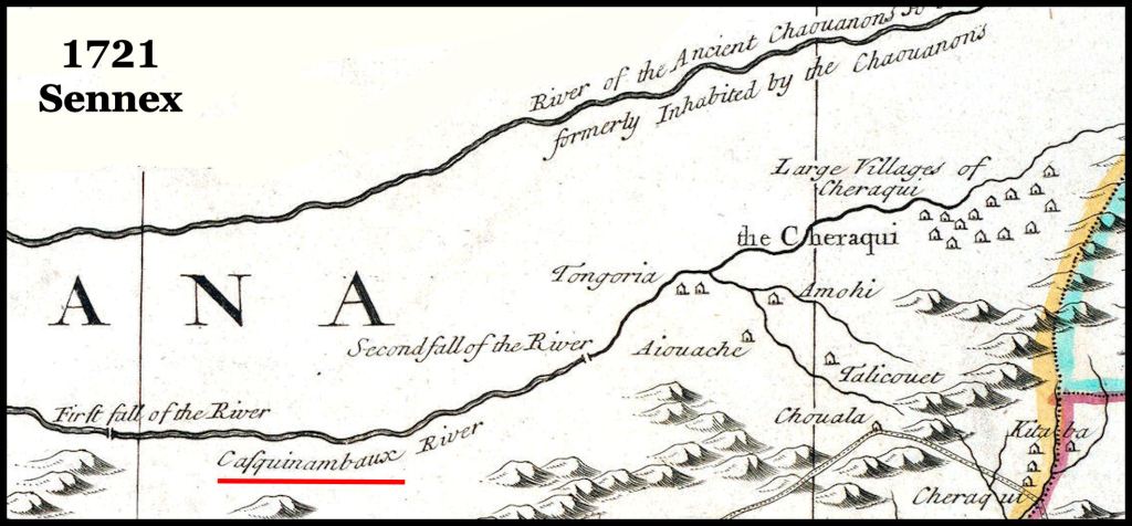 Few, if any readers, are probably familiar with the ethnic name, Casquinambaux (French) or Caskenampo (English), but they are recorded in the French and early South Carolina Colonial Archives as the most powerful tribe in what is now eastern Tennessee . . . that is, until after 1708. Their name disappears from the maps, other than a river’s name, after that time.