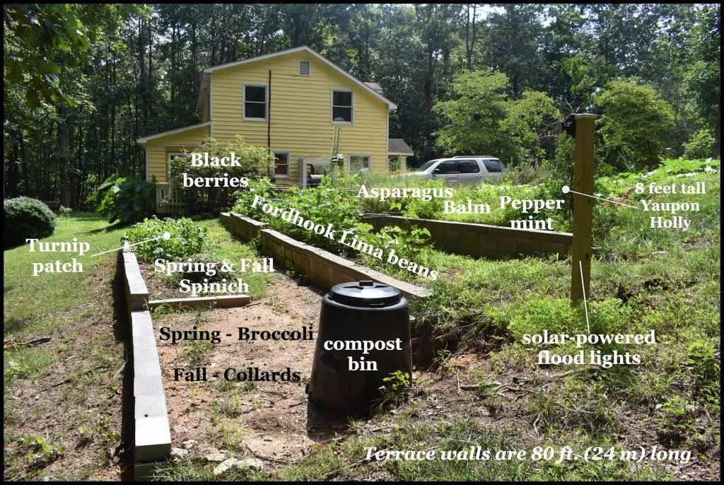Long ago, I learned much from studying Maya farmers in southern Mexico and the Guatemala Highlands. Through the two decades that I lived on large farms, this information was interpolated with the gardening techniques of my grandparents . . . which really were not that different than the techniques used by Maya farmers. So at my homestead in the Nacoochee Valley, I was able to create a relatively compact mountainside terrace garden, which will put food on the table most of the year. Both the collards and the turnips will survive mountain winters, if properly bedded. My blackberry mega-bush and rhubarb plants are so productive now, I plan to start making wine from them when temperatures cool a bit.