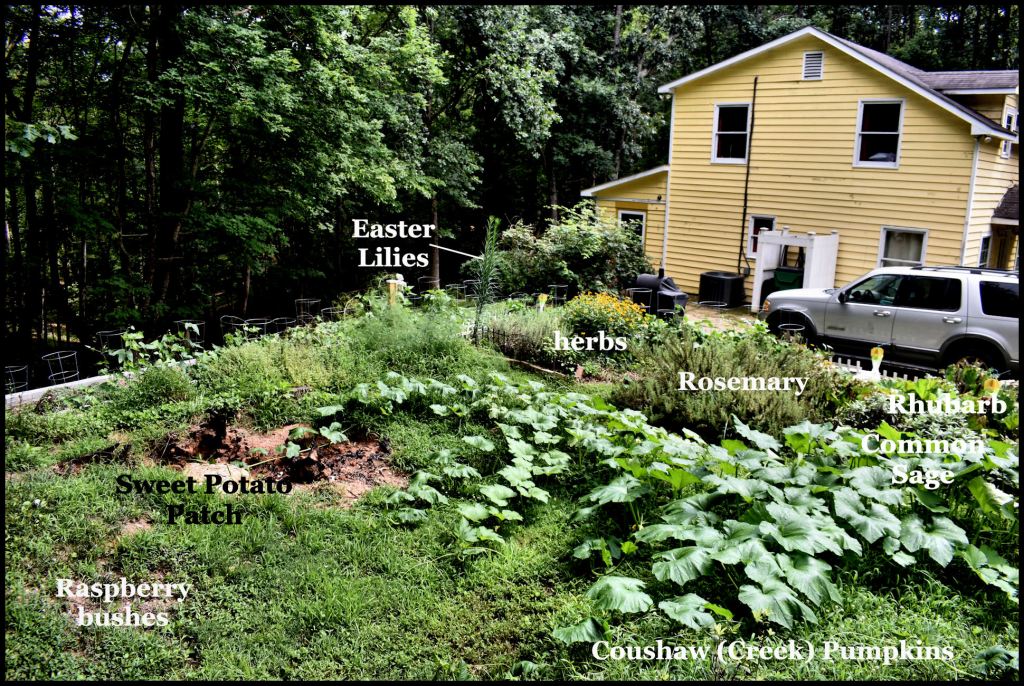My property is located at about 1800 feet above sea level at the crest of a low mountain overlooking the Chattahoochee River and Nacoochee Valley. Most of the property is a 100 ft.+ deep ravine, which is unsuitable for agriculture, but attracts a wide variety of critters. I have found deposits of volcanic ash, pumice and black lava bombs in the top soil, so apparently the two gas volcanoes 7 and 10 miles to the north were regular volcanoes in the recent past. The fertile volcanic soil is composed of volcanic ashes, plus many centuries of decomposed leaves and wood. It is acidic and therefore, for most crops must be “sweetened” with agricultural lime and crushed, cooked egg shells.