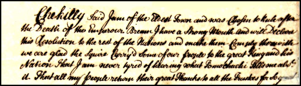 Chikili’s speech was translated by Mary Musgrove (Kvsapvnakesa ~ Mischievous Little Coosa Girl). Georgia Colonial Secretary, Thomas Christie, initially recorded her translation with an early form of shorthand. Later, Musgrove and Christie worked out a refined version of the speech, which was drafted on July 6, 1735.