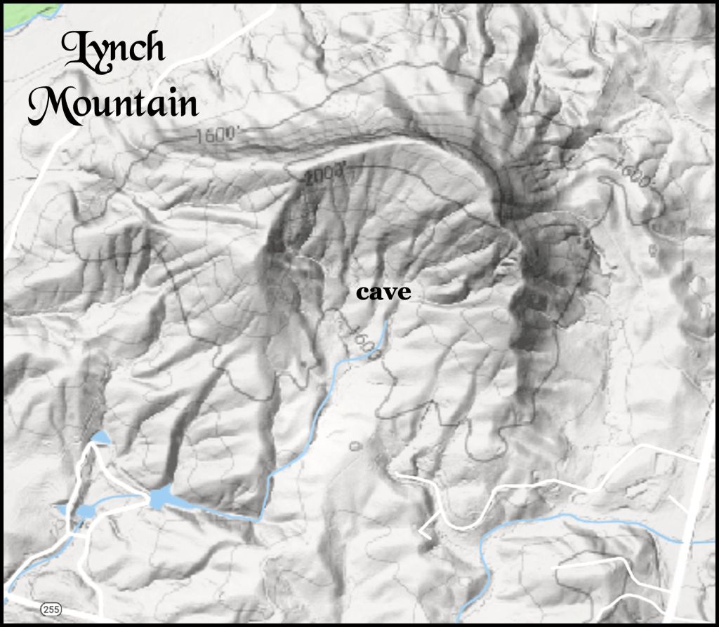 Lynch Mountain is an ancient, presumably extinct volcano, whose south wall collapsed in a violent eruption. A stream flows out of the cave (or perhaps fumarole) and flows southward into the Chattahoochee River. It is not known when the mouth of the cave collapsed, but event appears to have been relatively recent, because no trees are growing in the exposed portion of the cave. I did not attempt to find any artifacts. My policy is always not to disturb archaeological sites. I don’t even remove natural vegetation or detritus.