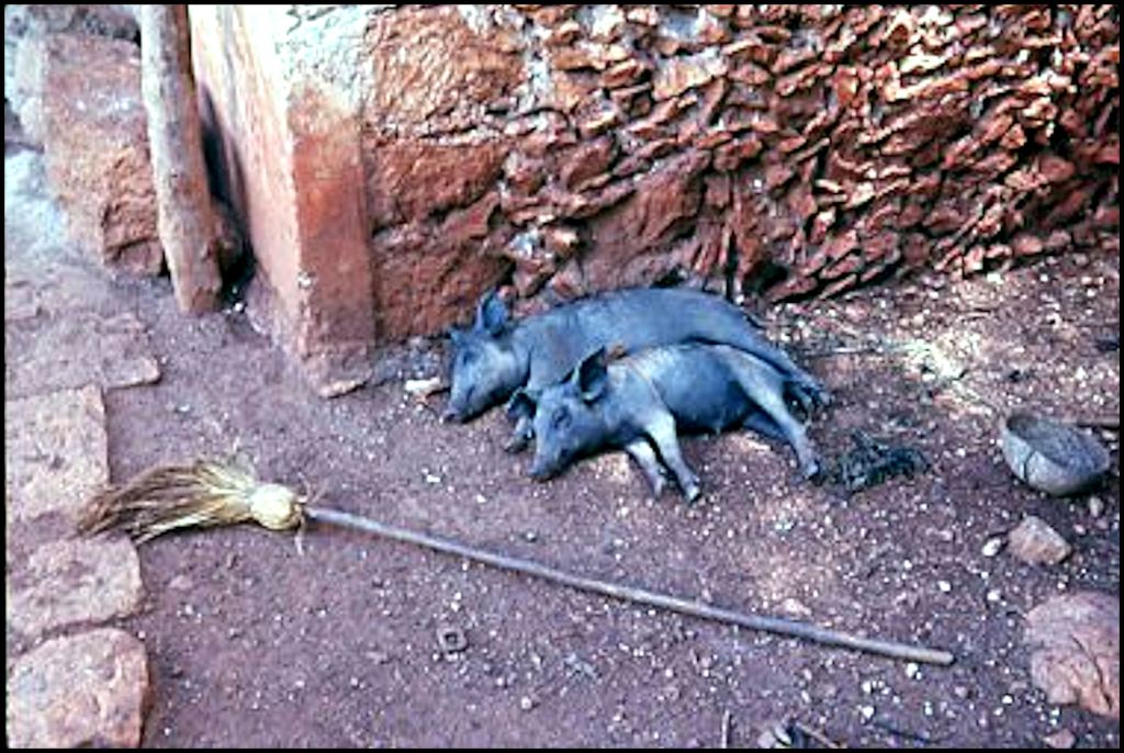 1. Story behind the little pigs – in case, you have not seen Part Two of my Campeche Videos. The 4′-8″ Maya site manager of Labna thought that we were newlyweds. She thought I was a VIP from Mexico City, because I was wearing an INAM photo ID, which said that I was an official guest of the Department of Cultural Relations. She gave us a big wedding feast and killed the piglets’ mother for the main course. In our first night under the same roof and alone, the pigs kept on coming into the Maya hut, wriggling under the mosquito net and snuggling against Ana. Ana was obviously quite a bit more interested in other things. We only had a sheet of plywood with rope hinges for a door. Ana finally blew her top and chased the piglets out into the jungle with frequent whacks of an authentic Maya broom. She threw the broom down as she was coming back into the hut. The next morning, the piglets were snuggled against that broom.