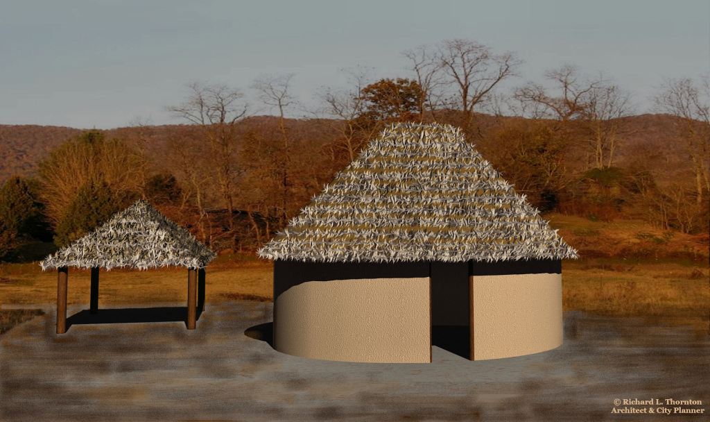 Archaeologist Arthur Kelly also found Soque-style houses near the Great Temple Mound at Ocmulgee National Historic Park. They dated from around 1000 AD to 1150 AD. The original houses on the acropolis at Ocmulgee were large, round South American style teepees.