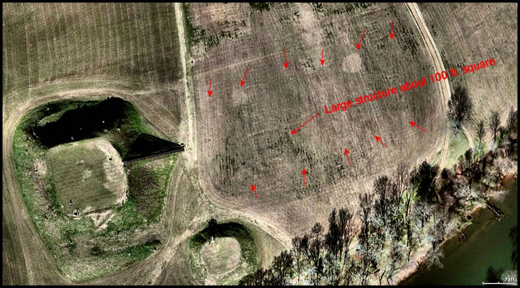 In 1954, archaeologists Arthur Kelly and Lewis Larson began preliminary work at Etowah Mounds. Noticing circles of greener grass on the main plaza, next to Mound A, Kelly ordered the sod to be scrapped away. What was found were two lines of 35-50 feet diameter houses, typical of the Apalache elite in the 1600s, plus a square structure about 100 feet on each side. Mixed with Lamar Culture artifacts, typical of the Creek Indians were 16th century European artifacts. Just as interpreted by Elias Cornelius, this occupation of Etowah Mounds had ended around 1700 AD.