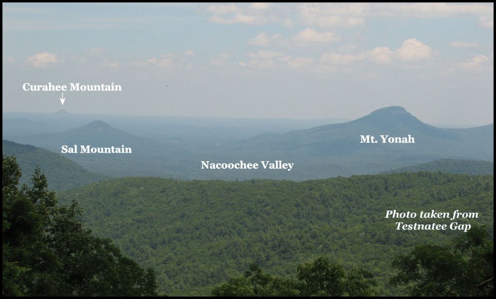 Archaeological Site 9WH28 – This section of the Nacoochee Valley is today the pasture for Chattahoochee Stables. In the foreground is the probable location of the 1646 Spanish fort. Beyond the tree line is the location of a Native American town site, excavated by archaeologist Robert Wauchope. It was permanently occupied from around 1000 AD to 1700 AD. Prior to that time period, it was a seasonal village site for hunter-gatherers. Over the town site, Wauchope had to cut through from 5 to 15 feet of alluvial sand, showing no evidence of human occupation. In the background is Sal Mountain, which is an extinct volcano . . . we hope!