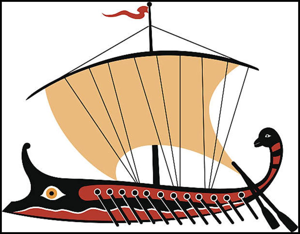 (1) The image on the right is a Late Bronze Age Greek warship, such as the one used by Odysseus as he and his crew sailed for ten years in an effort to get home to Ithaca from Troy. Cargo ships would not have had the ram at the water line of the bow. (See drawing below.)