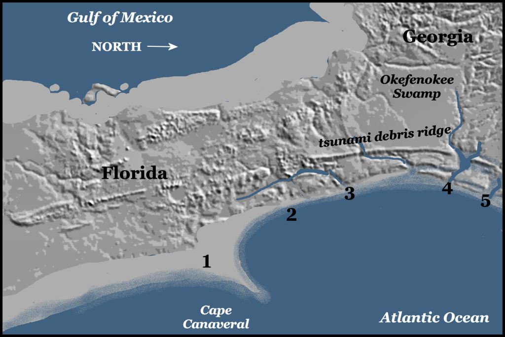 (4) Missing barrier islands on Florida’s northeast coast – Today there are no islands on Florida’s coast from the mouth of the St. Johns River southward to Cape Canaveral.