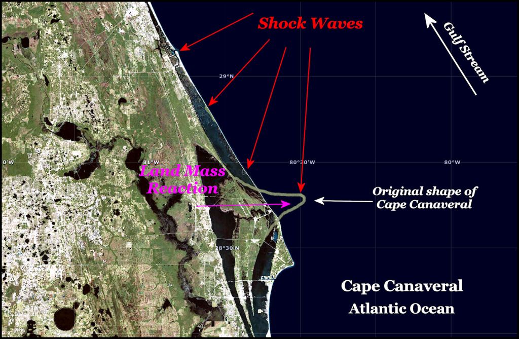 (1) Cape Canaveral should not be there! - Cape Canaveral juts out into the Atlantic Ocean in the face of one of Earth’s most powerful ocean currents, the Gulf Stream. The northern side of the cape forms the bottom of an ellipse. The top of the ellipse is formed by the mouth of the Altamaha River in Georgia, where the “South Atlantic Ridge” that we discussed in a previous article is at it’s highest point.