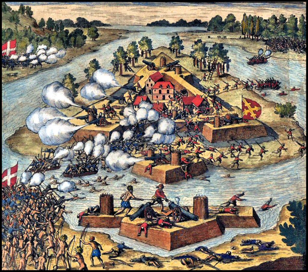 Dominique de Gourgues, a French nobleman and military officer, became outraged when he heard of the massacre of virtually all inhabitants of Fort Caroline and of the ship-wrecked survivors of Jean Ribault’s fleet. He sold all of his belongings and equipped a three ship fleet that sailed to the Americas to seek revenge. He did not tell his crews what the purposed of the voyage was until they landed in southern Cuba. At the time, the southern coast of Cuba was occupied by a mixture of Sephardic Jews and Maya refugees, who hated the Spanish government and sold supplies to ships from other nations.
