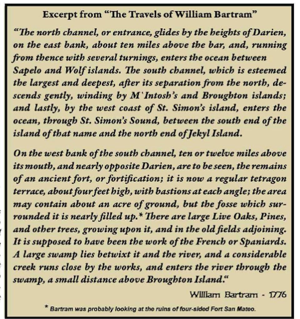 Expecting an attack by French Protestant ships from La Rochelle, France at any time after the massacre of Fort Caroline, Spanish engineers erected identical Fort San Felipe on Parris Island, SC and Fort San Mateo on the South Channel of the Rio Secco (Altamaha River) in what is now Georgia.
