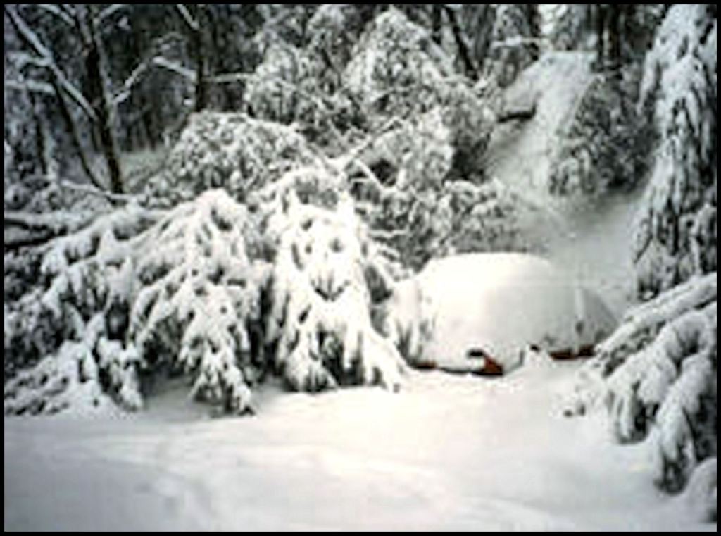 The temperatures on our farm dropped from 75° F. ( 23.9 C.) to -5° F. (-20.6 C. ) in less than 24 hours. Officially, our end of Shenandoah County, VA received 36″ (91.4 cm) of snow, but because the winds were blowing up to 60 mph (97 kmph) there was a modest coating of snow in exposed areas, such as the board fence in the foreground, However, look in the back of this view and you will see a three story barn with 12 feet ( 3.7 m) of snow banked against it. The north side windows of our house were almost completely covered by snow.