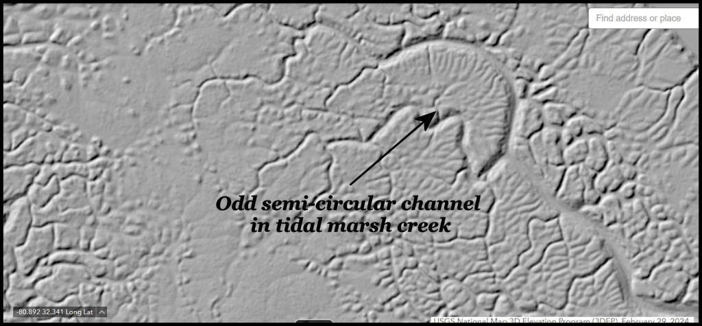 It seems odd that Mother Nature would create a perfect semi-circular bypass for a tidal creek. It is possible that there was a circular burial mound, composed of packed clay, which caused the water to pass the structure.
