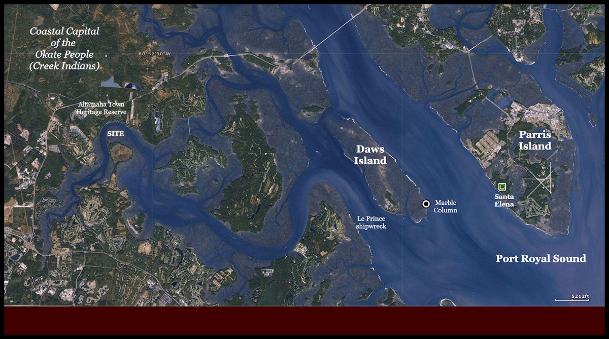 The small island is located near Bluffton, South Carolina between Port Royal Sound, SC and Savannah, Georgia. It is in the Colleton River near an important archaeological zone, which last functioned as the Capital of the Yamasee Confederacy (Native Americans). However, for many centuries before then, it was occupied by a branch of the Creek Peoples, most people associate with the Altamaha River in Georgia.