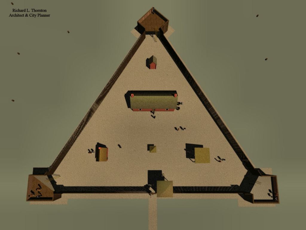 The corners of the triangle contained one to three raised bastions. These forts were in remote locations and thus, were not likely to have cannons on the bastion . . . unless it was small cannon tube that could be hauled on the back of a pack horse, mule or donkey.