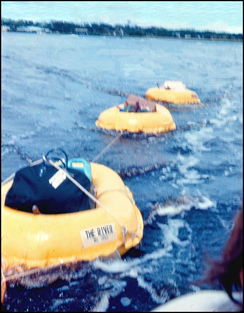 Here is a good photo of Craig’s minuscule catamaran (with its mast down) and prototype, underpowered jet ski, plus the three life rafts. We are unloading the rafts and setting up the camp site. These tiny vessels transported us over seven miles of the St. Marys River and St. Marys Sound. Actually . . . never again would I be so stupid to pull off such a dangerous stunt.