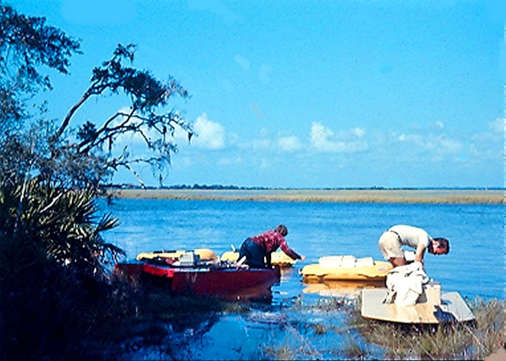 Totally exhausted, we searched the edge of land until we found what appeared to be a small, old Indian mound. We pitched our tents on the mound in the midst of dense Spanish bayonet shrubs then quickly put together some ham and cheese sandwiches for dinner . . . then collapsed asleep.
