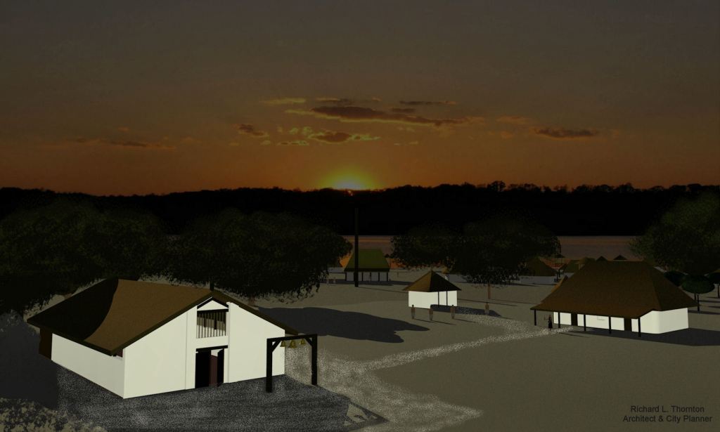Most Wahale families had multiple homes. There was one in a formally planned village on a large estuary in the western edge of the island as portrayed in the rendering at the top of the article. Only certain sections of the island were suitable for agriculture. During the warmer months, the families would live on scattered farmsteads like the one pictured above. The houses were timber framed with wattle and daub walls, which were stuccoed with a hard lime-based stucco, reinforced with crushed oyster shells. This is the ancestry of “Tabby” architecture.