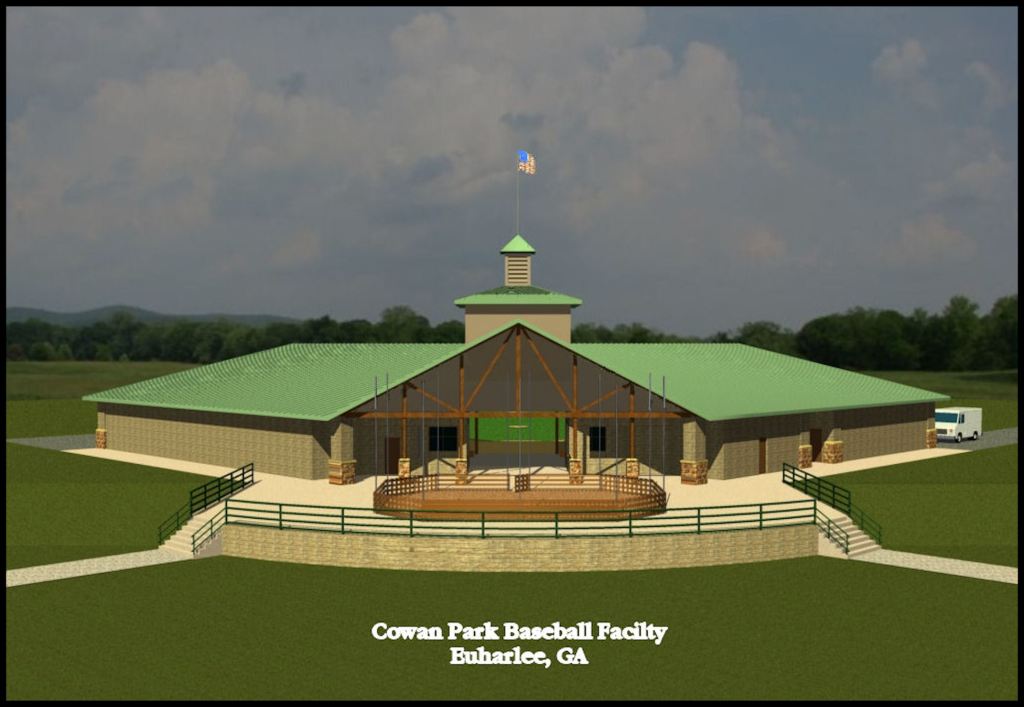 I completed plans for this classy amateur baseball park in a booth at a video games parlor in Robbinsville, NC, while living in a tent on Lake Santeetlah, NC! My official architecture office address was a post office box in Blairsville, GA.