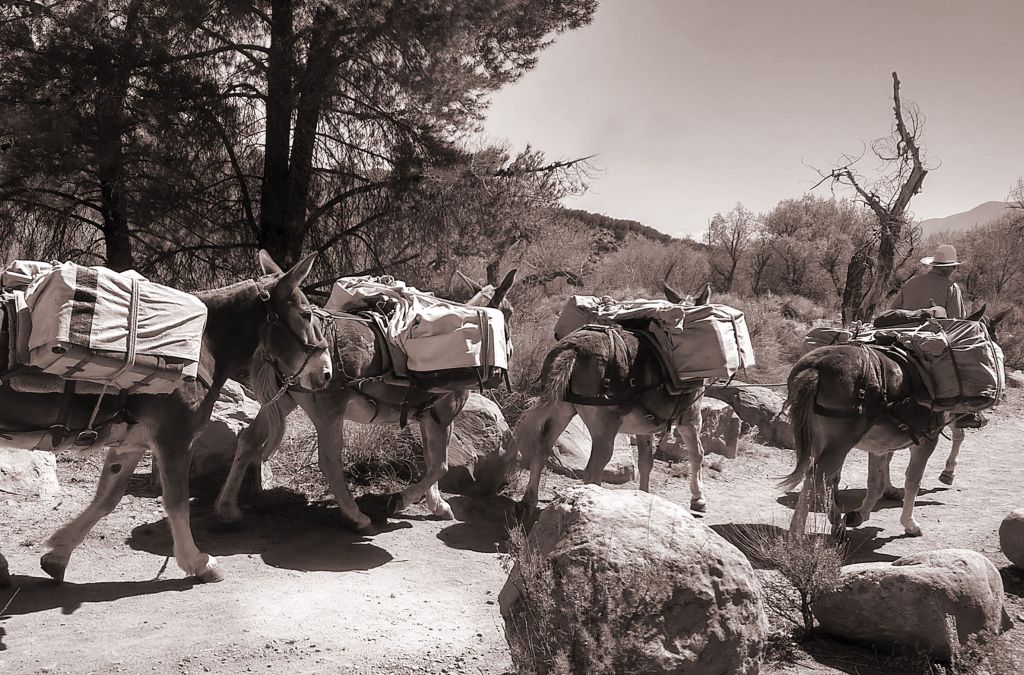 Imagen superior: Este dibujo realizado por computadora por el arquitecto muestra una recua de mulas que sale del puesto comercial español en la ruta Unicoi. Intercambiará productos manufacturados europeos por pieles, cueros de ciervo y gemas en el valle del río Tennessee.