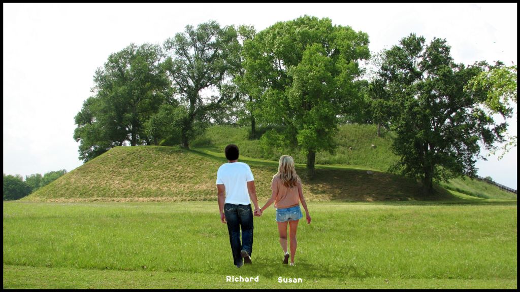 The South side of Mound A in 1998, when Susan Karlson and I were visiting the site. I lived near Etowah Mounds from June 1995 until December 1998. This is actually a staged photo. LOL Just before then, after knowing me for seven years, for the first time, Susan held my hand in public. I asked a tourist to take our photo at the same location, holding hands and walking together.