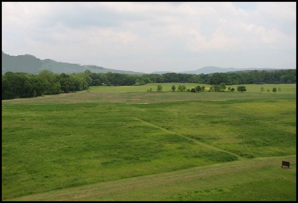 Panoramic view from the top of Etowah Mound A in 1998, when I was living in Cartersville and visiting the site with Susan Karlson. A few years later, a mega-millionaire’s mansion was built on top of a low burial mound near the river bank, just beyond the boundaries of the state-owned property. Several FEMA, National Park Service and City of Cartersville, GA employees, who refused to issue a building permit for this mansion in the primary Flood Hazzard Zone on top of Native American burials, were fired.