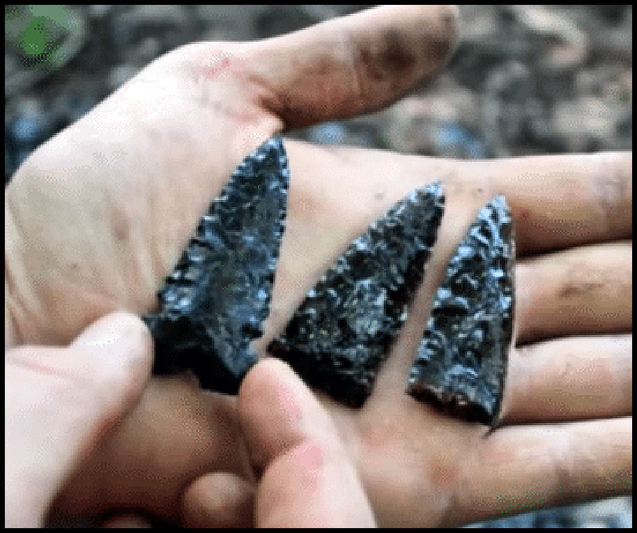 The portion of my obsidian artifact collection from a battlefield on the crest of Cerro Gordo, overlooking Teotihuacan. The obsidian artifacts from Puebla, Chiapas and Michoacan States are a slightly different color.