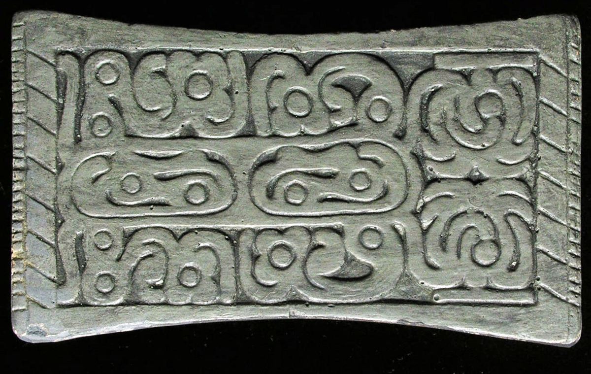 Image Above: This is the famous Cincinnati Tablet, found immediately across the Ohio River from the state of Kentucky. Measuring approximately 5 inches in length, 3 inches in width, and 0.5 inches thick, the Cincinnati Tablet is made from a very fine-grained sandstone and is considered the most sophisticated example of Adena Art. The tablet was probably used for applying tattoos or dying cloth. Adena art was quite similar to the wooden paddles carved by Austronesians and Polynesians for applying tattoos and dying cloth.