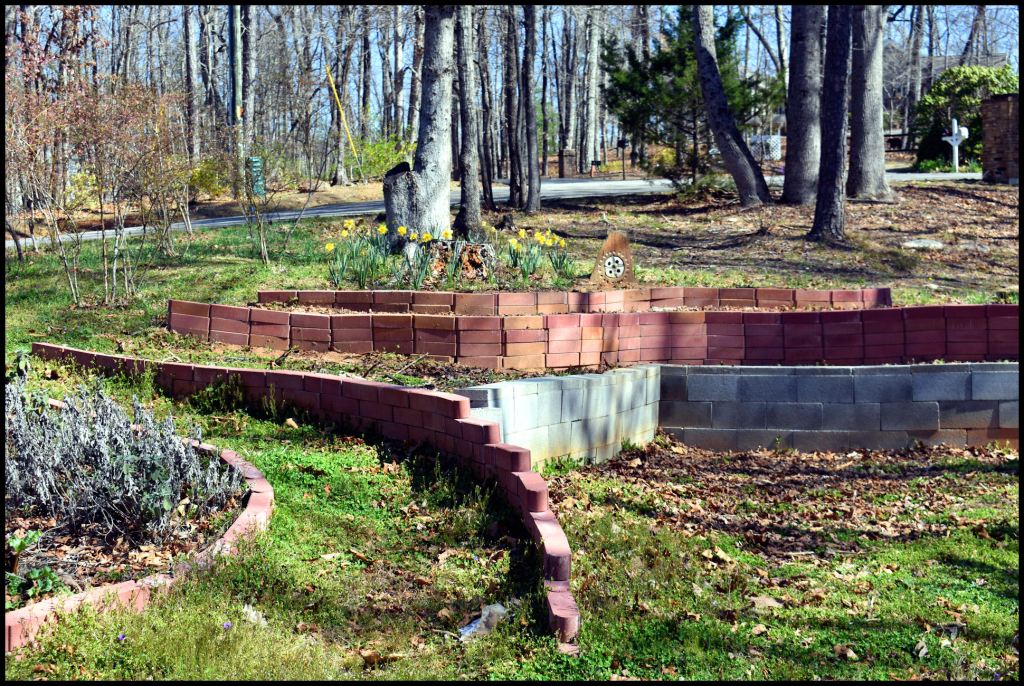 Another view of the front garden. I built the stone wall and all the concrete masonry walls. There were only two shrubs and no grass on the property, when I bought it. A tree service had to cut down 57 large trees near the house and in the front to make it possible to insure the house. Several large trees were about to fall on the house!