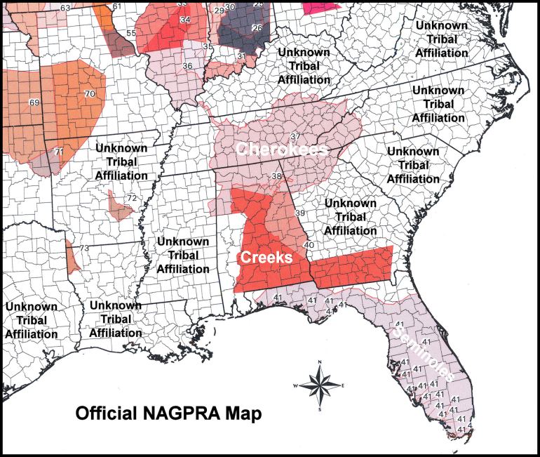 This official NAGPRA map of the Southeast does not even mention the Choctaw, Chickasaw, Catawba, Miccosukee, Alabama, Shawnee, Chickahominy, Monacan, Nansemond, Pamunkey, Rappahannock, Mattaponi, Chitimacha, Coushatta, the Jena Band of Choctaw, and the Tunica-Biloxi. . . . all federally-recognized tribes.