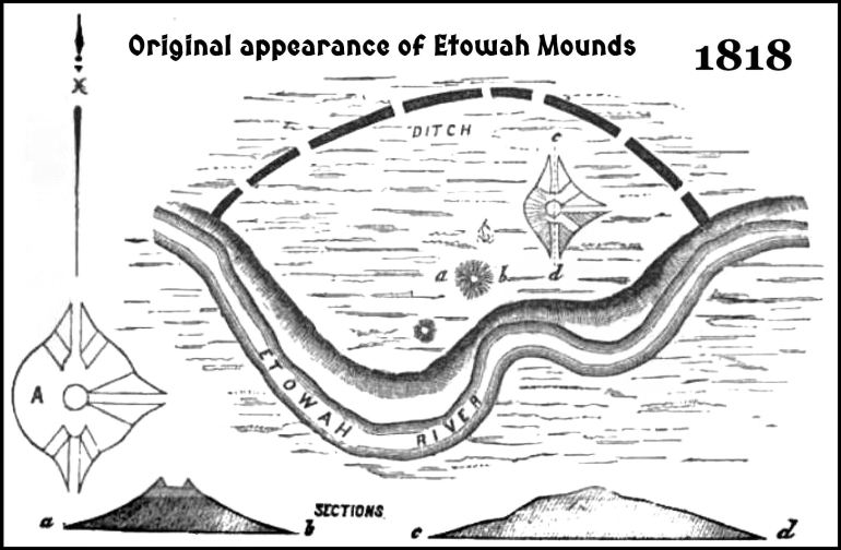 The mounds that you see today at Etowah Mounds National Historic Site bear little resemblance to the appearance of the ancient town site two centuries ago. This is a measured plan of the site in 1817, when there was a 20 year old Cherokee village located about one mile to the north, where the Roselawn Estate now exists in Cartersville. Elias Cornelius, a Natural Science professor Yale College measured and sketched the mounds.