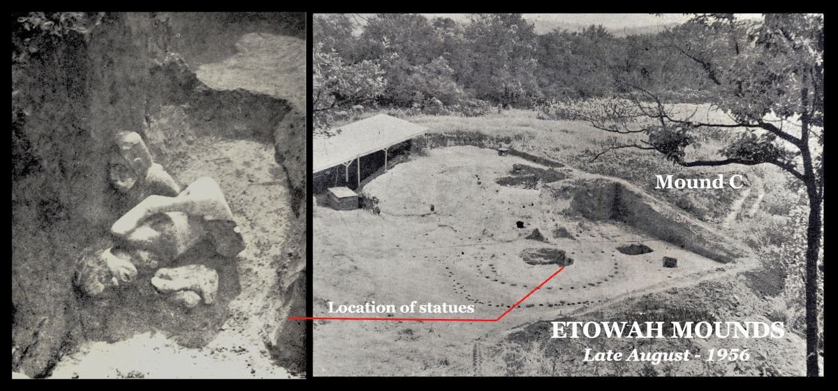 In 1995, they even created a very expensive and very fictional diorama in the Etowah Mounds Museum that showed the famous Etowah Marble Statues being hastily buried at the TOP of Mound C as Cherokees “captured and burned” Etowah around 1585 AD. Several members of this clique were definitely on the payroll of wannabe Cherokee gambling casino developers.