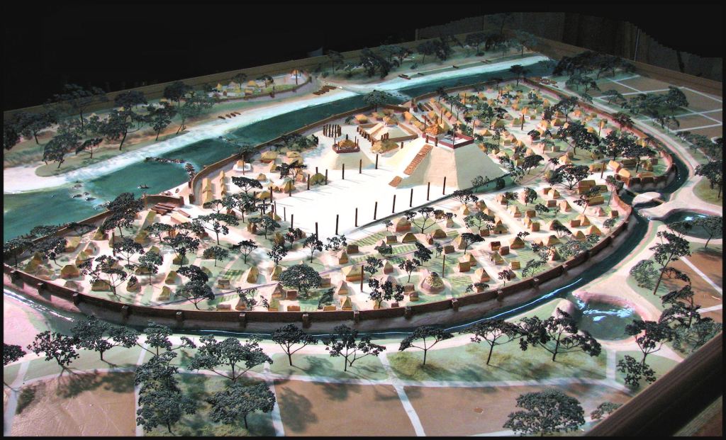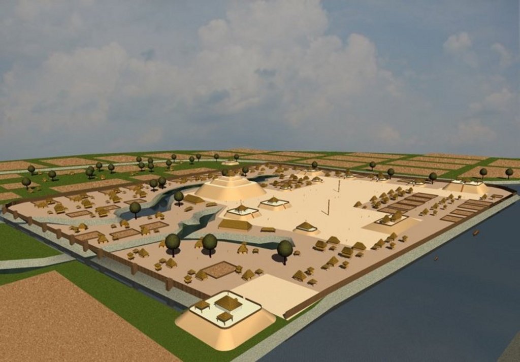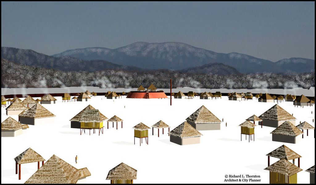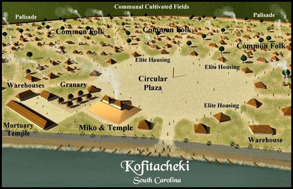 Birdseye view of Kofitacheki (Cofitachequi in Spanish) based on De Soto Chronicles