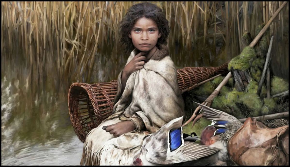 Image Above: Northern European Hunter-Gatherers had dark hair, tan skin and pronounced cheek bones. They looked little different than a Northern Sami, mixed-blood Native American or a Latin American mestizo. Painting by Tom Björklund at the Museum Lolland-Falster