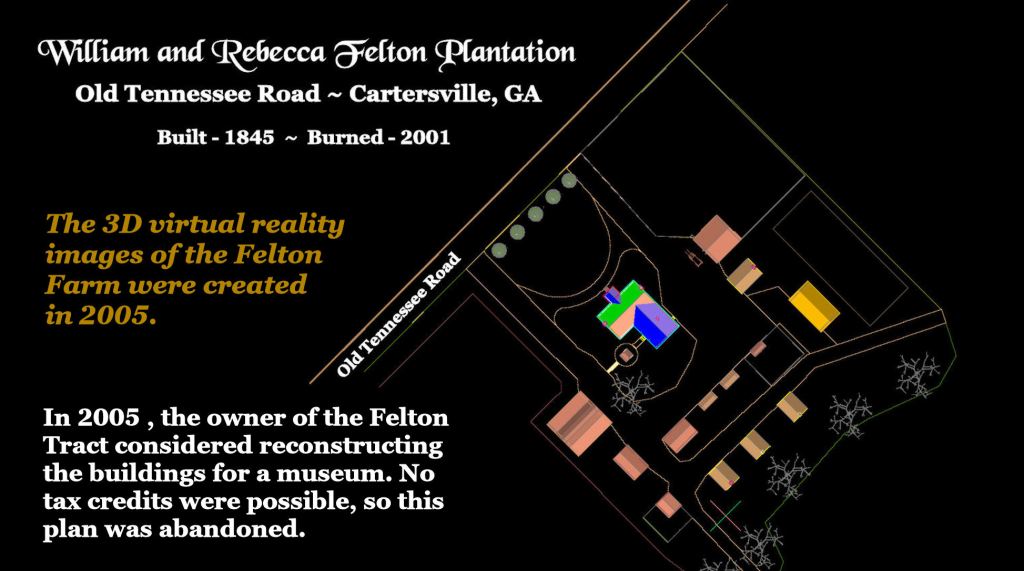 The Felton Farm was located immediately north of Cartersville, GA on the Old Tennessee Highway. It was burned by arsonists in 2001, while undergoing restoration for conversion into a history museum.