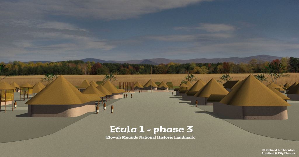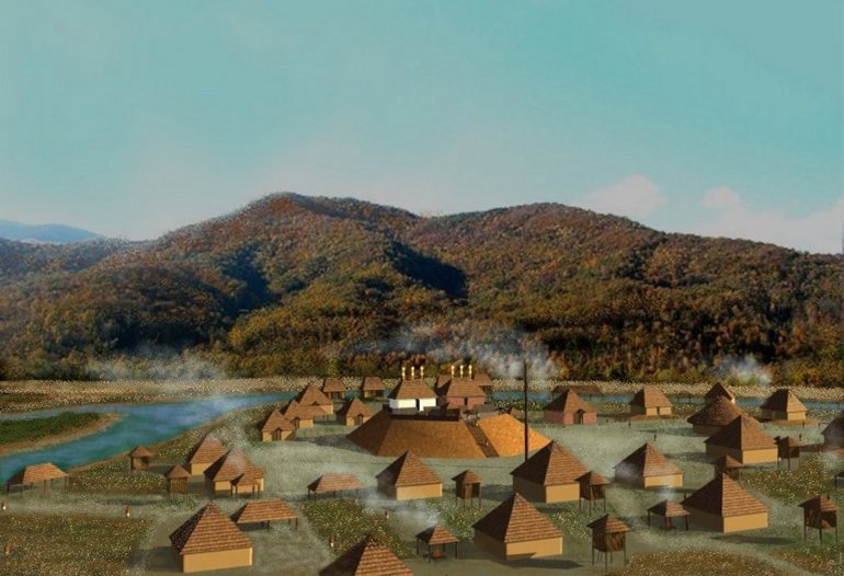 The original village, built by Chontal Mayas on the Etowah River as it appeared around 1000 AD.