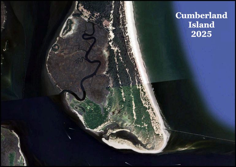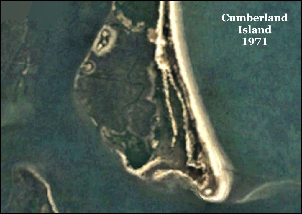 As you can see below, Cumberland Island has grown southward 2,240 ft (682.24 m) since 1971, when the satellite image was taken in preparation for the State of Georgia giving the island to the National Park Service. The cause or causes of the island’s rapid growth are not fully understood. Unlike the situation on the Florida Coast, Mother Nature seems to be adding more sand to Cumberland as the ocean level rises. Thus, over time. the island will move southward and westward as ocean levels rise.