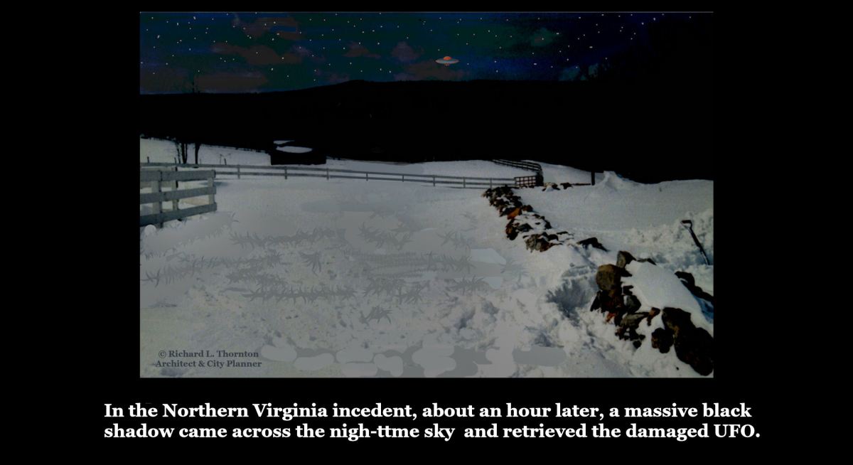 Readers may recall from “The Shenandoah Chronicles” online book that three of these small, spherical UFO’s fought a battle with a larger UFO over the skies of Virginia about 35 years ago. The larger UFO was forced to land at the back lawn of the Shenandoah County Treasurer on top of Little North Mountain. Unlike the current sighting, the earlier incident was concealed from members of Congress and the public living, outside of Northern Virginia . . . but inspired the TV blockbuster, “The X-Files.”