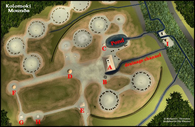 After the construction of unique “keyhole” houses ceased at Kolomoki around 600 AD, their construction can be seen moving progressively up the Mississippi River to southern Illinois in around 800 AD.