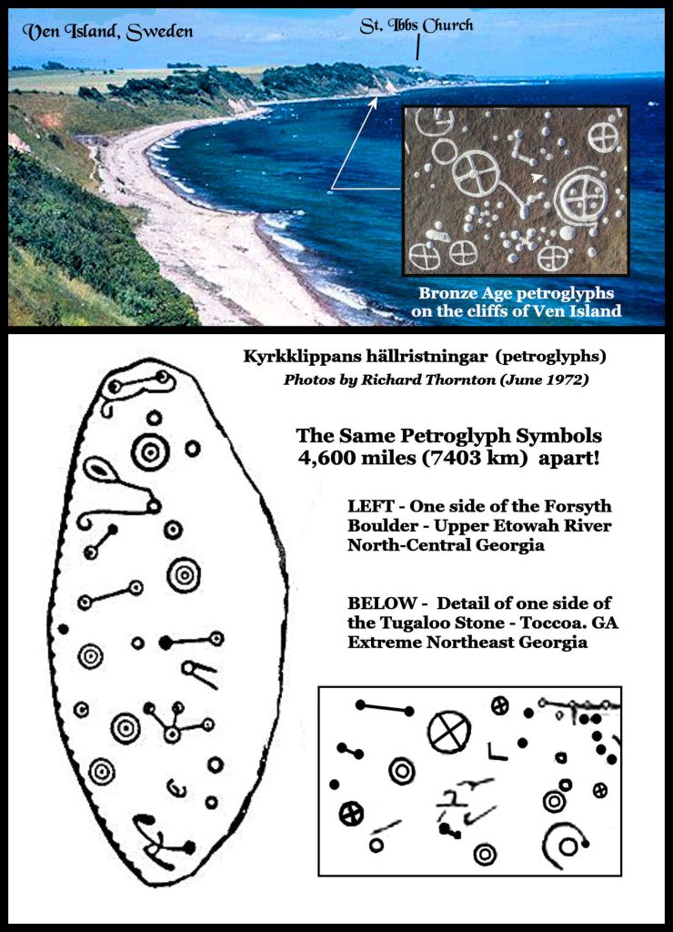 For generations, academicians have rammed down the throats of students that no one came to the Americas from Europe before Columbus . . . except for a few Vikings in Newfoundland for a generation or two. This “irrefutable fact” is obviously a myth. All of the Pre-Columbian symbols found on the Track Rock Petroglyphs in northern Georgia may be found on petroglyphic sites in southern Sweden.