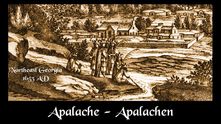 The Appalachian Mountains get their name from the plural of Apalache. This scene is a lithograph of a scene sketched by Richard Brigstock in 1653 about a mile north of Helen, GA at the confluence of the Chattahoochee River and Smith Creek.