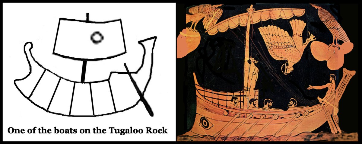 On the left above is one of several Bronze Age ships portrayed on petroglyphs in northeast Georgia near the headwaters of the Savannah and Chattahoochee River. On the right is a 2500-year-old Greek vase, portraying an early form of the Greek pentekonter ship, commanded by Odysseus.
