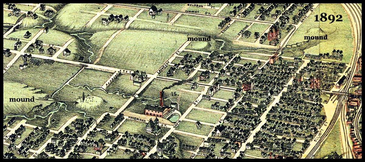 Many thanks to long time friend, Edna Dixon, for tipping me off about this forgotten chapter of Atlanta’s past. I was able to find this intricately detailed map, which clearly illustrates the large mounds. Several Creek town sites have been pinpointed along the Chattahoochee River, Peachtree Creek and Nancy Creek, but perhaps because Atlanta developed around the nearby intersection of two major railroads, these three mounds and undoubtedly several smaller mounds in between, were quickly forgotten.