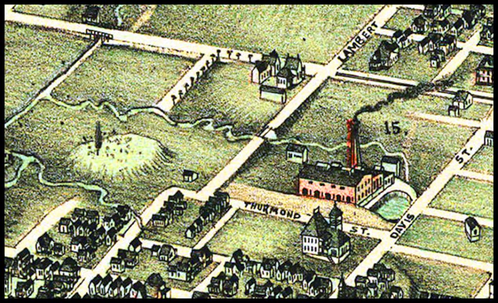 These are details of the 1892 Koch Birdseye View of Atlanta. In the map immediately above readers can clearly see Atlanta’s first water treatment plant, which pumped water from a large artesian spring to the remainder of the rapidly growing city . To the west is a massive mound, situated between two springs and small streams. Note the road running east-west on the upper end of this detail map It has been built on fill soil to span the former lake bed. The two streams come together and are spanned by a bridge. Maps prepared by engineering officers of the Confederate Army showed this area to be inside the fortifications of Atlanta, but undeveloped, because of the wetlands and ponds.