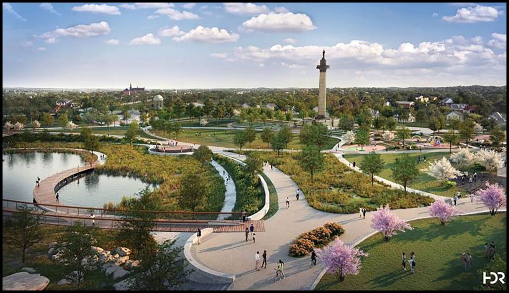 Virtual Reality Image of the park with the statue of Tomochichi installed atop a tall column