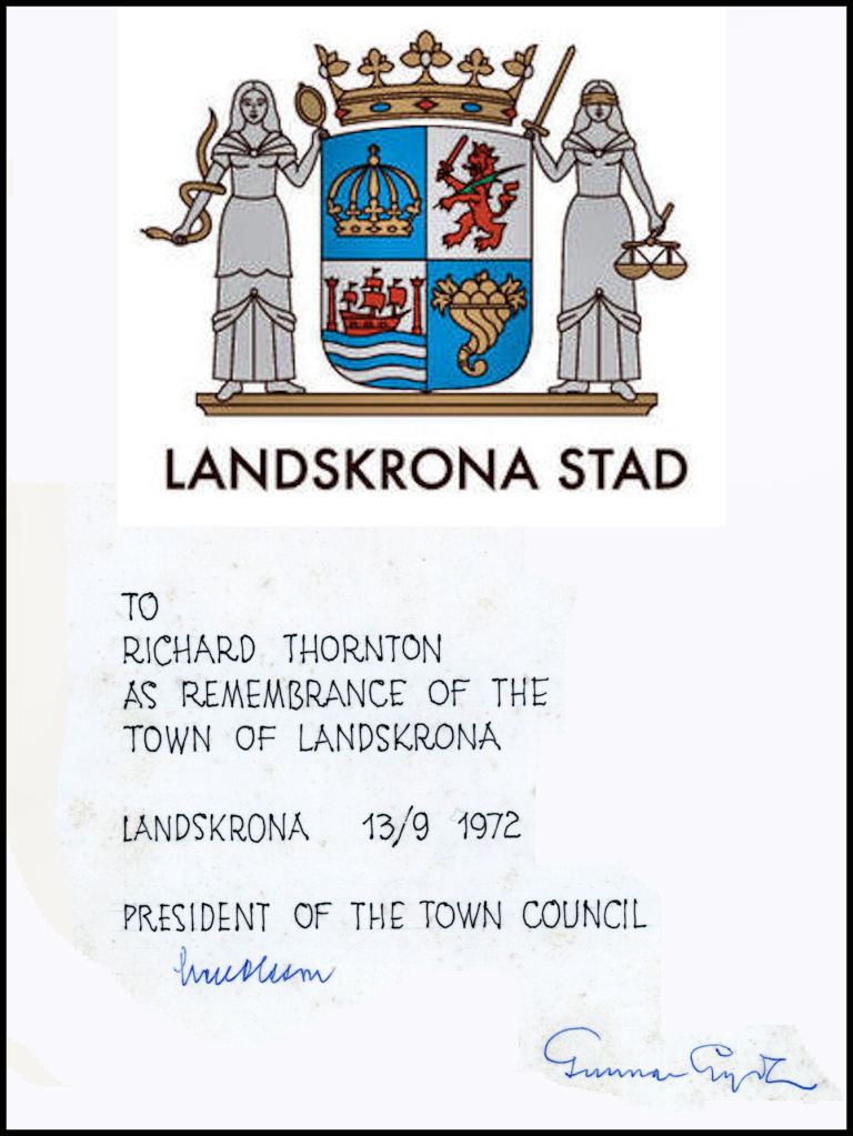 Shortly after I returned to Landskrona after being at Ground Zero at the Black September terrorist attack on the Munich Olympics, the leaders of the city held a ceremony, where they gave me several gifts, including the Seal of the City. The Black September cell that I had been watching down the hall in my apartment building “had gotten the heck out of Dodge City” in August.